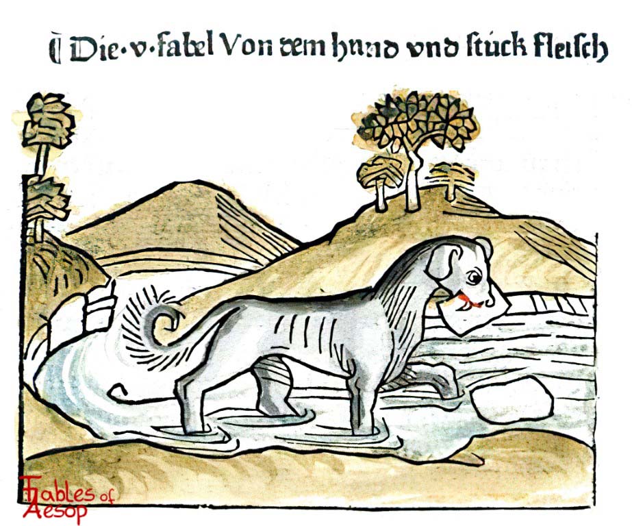 Ada seekor anjing yang baru saja mencuri sepotong daging. Ia berlari menghindari kejaran pemiliknya. Si anjing memutuskan melewati jembatan dan menyeberangi sungai agar tidak bisa . . .